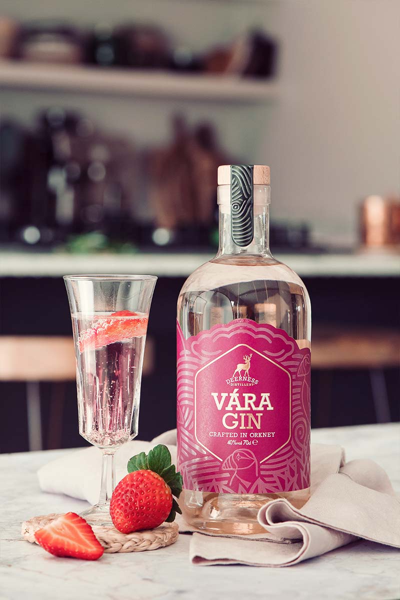 Vara in Old Norse means ‘becoming spring’, hence the beautiful puffin illustration. Puffins, or ‘tammie norries’ as they’re known in Orkney, spend most of their life at sea, but they can be found all over the cliffs of Orkney between April and August. Key botanicals include tarragon, rosemary, elderflower, lemon grass and red grapefruit. The gin is infused with pink rose petals post distillation, which is what gives the gin its beautiful pink colour.